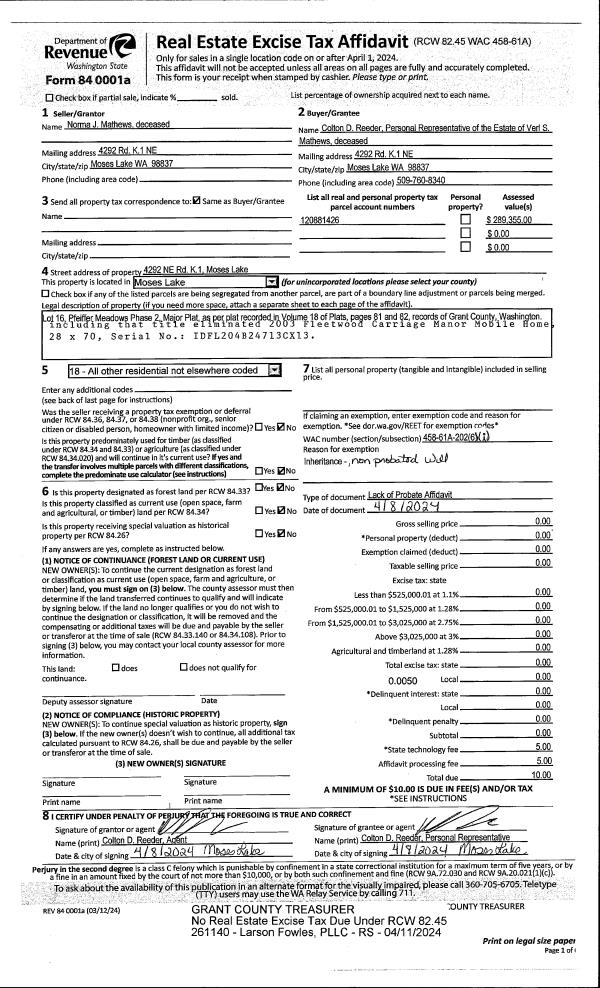 | 2 | 04/08/2024 | AFF OF HEI | Affidavit of Heirship | Mathews Est, Norma June | Reeder Pr, Colton D | | | $0.00 | 261140 | 1497821 |