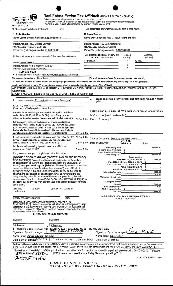 | 1 | 02/05/2024 | SWD | Statutory Warranty Deed | Flickinger, James Edward | Molitor, Dan & Jada | | | $185,000.00 | 260520 | 1495622 |