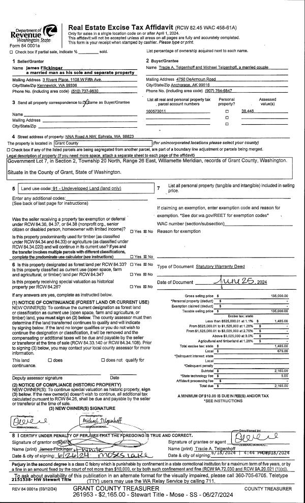 | 2 | 06/25/2024 | SWD | Statutory Warranty Deed | Flickinger, James Edward | Telgenhoff, Tracie A & Michael | | | $135,000.00 | 261953 | 1500793 |