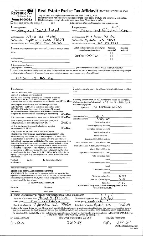 | 1 | 03/26/2024 | QCD | Quit Claim Deed | Laird, Amy & David | Laird, Jacob & Felicia Ziemer | | | $0.00 | 261238 | 1498192 |