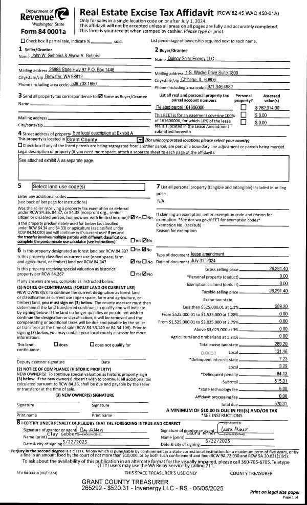 | 1 | 07/31/2024 | EASE | Easement | Gebbers, John W Cascade & Alycia | Quincy Solar Energy LLC | | | $26,291.00 | 265292 | 1512864 |