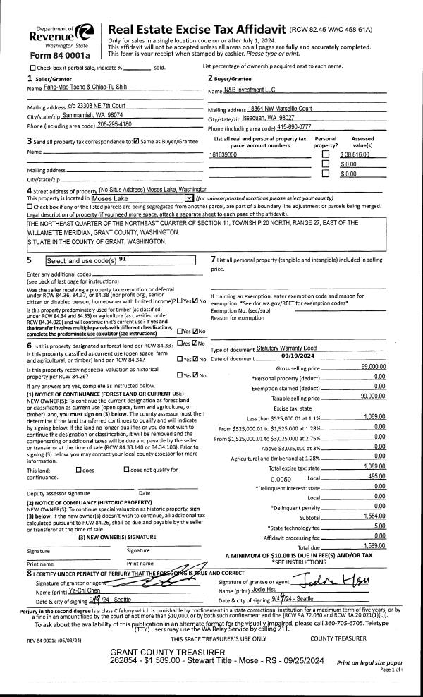 | 1 | 09/19/2024 | SWD | Statutory Warranty Deed | Tseng Etal, Fang-Mao | N & B Investment LLC | | | $99,000.00 | 262854 | 1503912 |