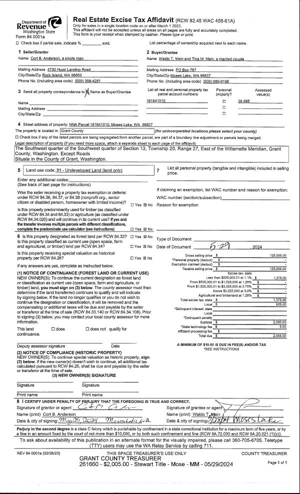 | 2 | 05/29/2024 | SWD | Statutory Warranty Deed | Anderson, Cort B | Main, Waldo T & Tina | | | $125,000.00 | 261660 | 1499625 |