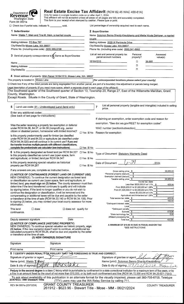 | 1 | 06/21/2024 | SWD | Statutory Warranty Deed | Main, Waldo T & Tina | Shantz-Kreutzkamp, Solomon Benno & Miette Nicole Dahlgren | | | $38,685.00 | 261912 | 1500613 |