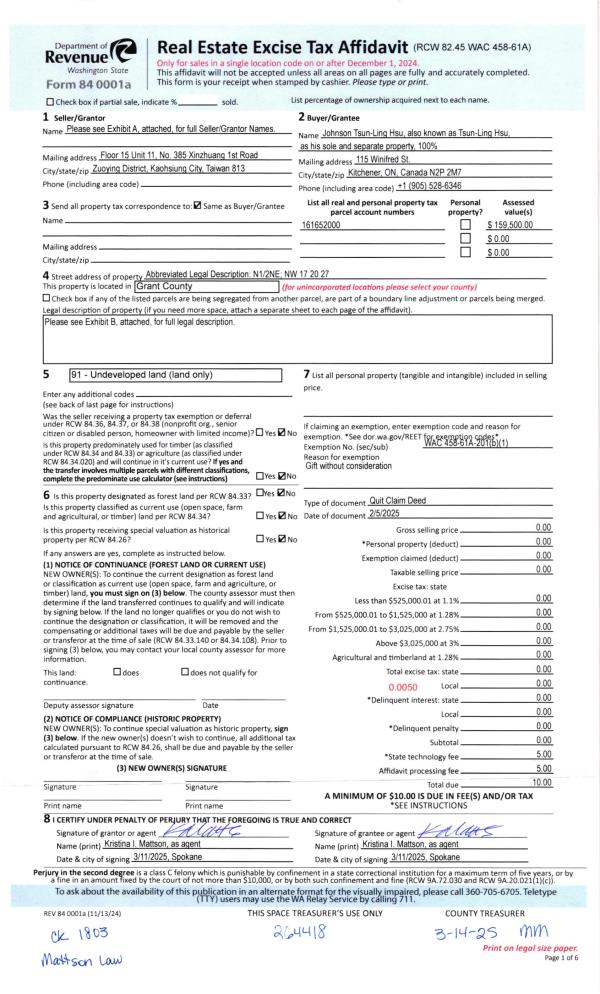 | 1 | 02/05/2025 | QCD | Quit Claim Deed | Hsu, John Shih-Hsieh | Hsu, Johnson Tsun-Ling | | | $0.00 | 264418 | 1509804 |