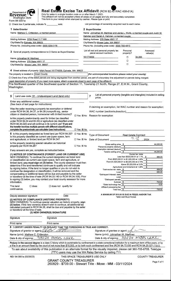| 2 | 03/08/2024 | REC | Real Estate Contract | Crittendon, Mathew C | Martinez Etal, Johnathan M & Jamie L Wolfe | | | $44,000.00 | 260829 | 1496696 |