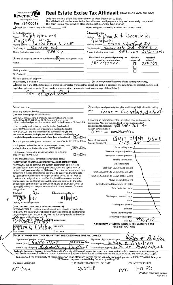 | 1 | 01/13/2025 | QCD | Quit Claim Deed | Hirz, Ralph S & Marjorie L | Nicholson, William E & Jeannie R | | | $0.00 | 263938 | 1507904 |