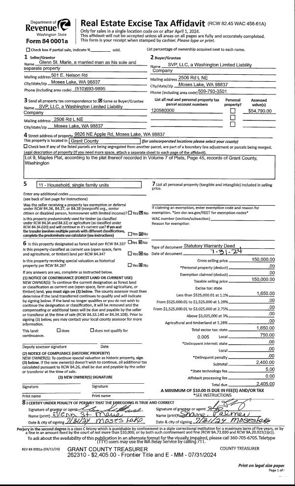 2 | 07/31/2024 | SWD | Statutory Warranty Deed | St Marie, Glenn | SVP LLC | | | $150,000.00 | 262310 | 1502013 |