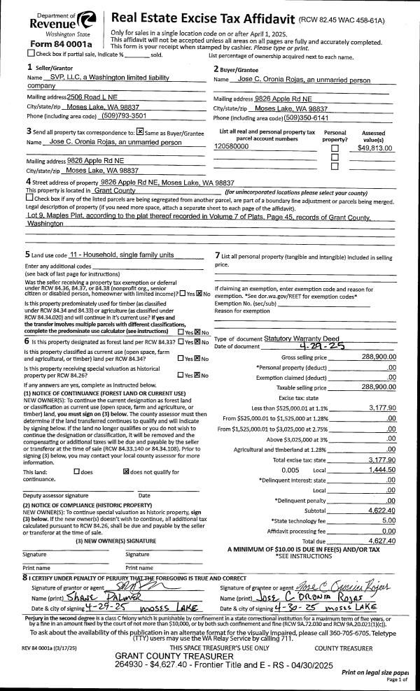 1 | 04/30/2025 | SWD | Statutory Warranty Deed | SVP LLC | Oronia Rojas, Jose C | | | $288,900.00 | 264930 | 1511527 |