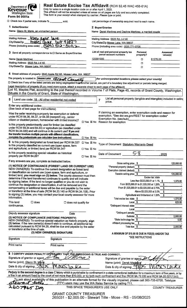2 | 05/08/2025 | SWD | Statutory Warranty Deed | St Marie, Glenn | Martinez, Derek & Daphne | | | $125,000.00 | 265031 | 1511854 |