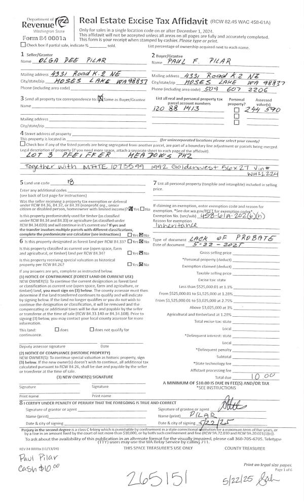 | 1 | 05/22/2025 | QCD | Quit Claim Deed | Pilar Est, Olga Dee | Pilar, Paul F | | | $0.00 | 265151 | 1512347 |