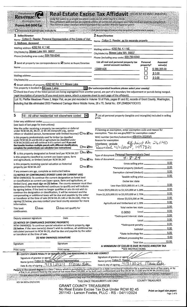 | 1 | 04/08/2024 | PRD | Personal Representatives Deed | Reeder Pr, Colton D | Reeder, Colton D | | | $0.00 | 261143 | 1497829 |