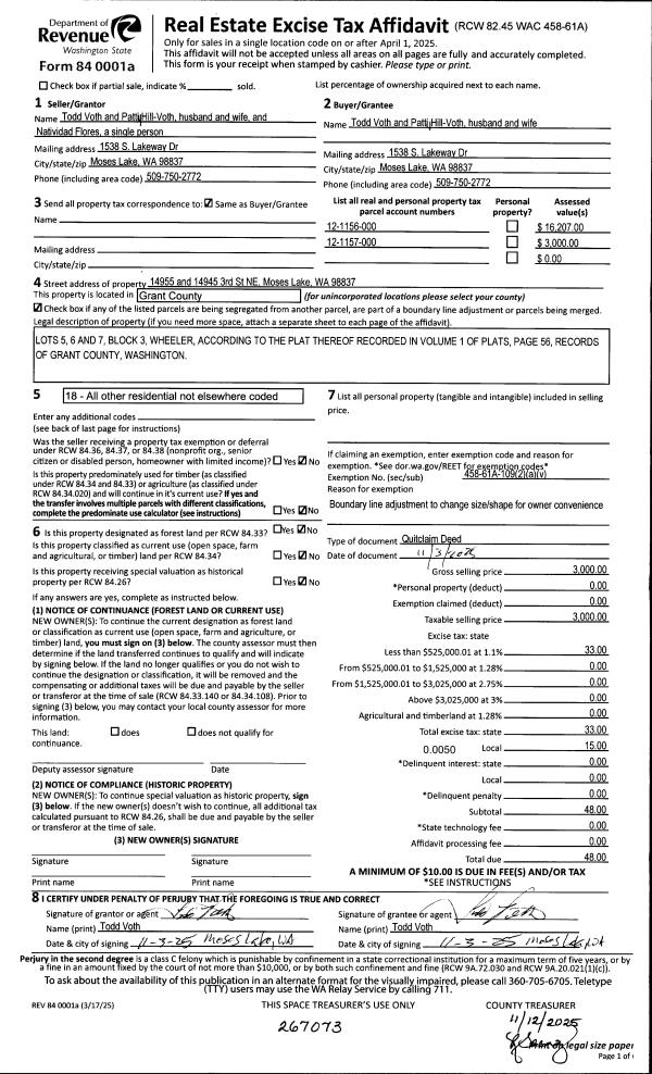 | 1 | 11/03/2025 | QCD/BLA | Quit Claim Deed/Boundary Line Adjustment | Flores, Natividad | Voth, Todd & Patty Hill-Voth | | | $3,000.00 | 267073 | 1519318 |
