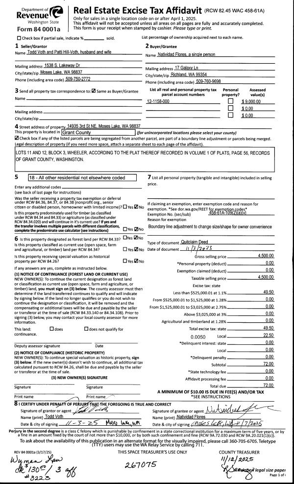 | 2 | 11/03/2025 | QCD/BLA | Quit Claim Deed/Boundary Line Adjustment | Voth, Todd & Patty Hill-Voth | Flores, Natividad | | | $4,500.00 | 267075 | 1519320 |