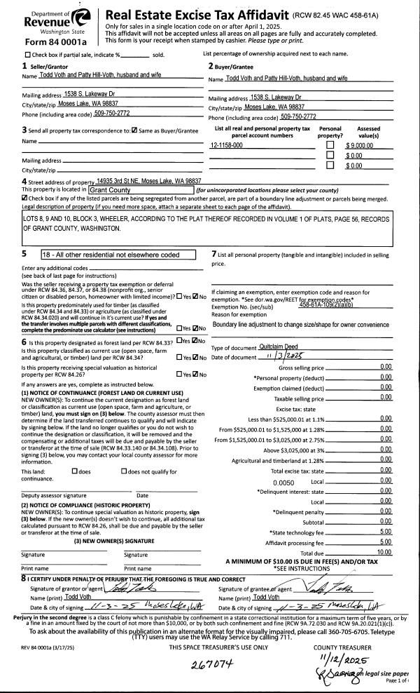 | 3 | 11/02/2025 | QCD/BLA | Quit Claim Deed/Boundary Line Adjustment | Voth, Todd & Patty Hill-Voth | Voth, Todd & Patty Hill-Voth | | | $0.00 | 267074 | 1519319 |