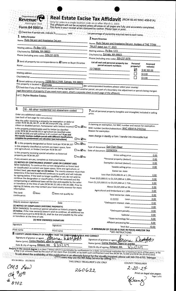 | 2 | 02/08/2024 | QCD | Quit Claim Deed | DeLeon, Rudy & Anastasiya | DeLeon Trs, Rudy & Anastasiya | | | $0.00 | 260622 | 1496006 |