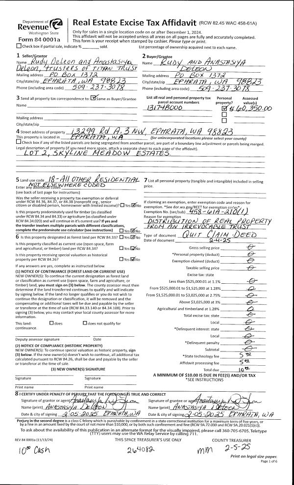 | 1 | 02/04/2025 | QCD | Quit Claim Deed | DeLeon Trs, Rudy & Anastasiya | DeLeon, Rudy & Anastasiya | | | $0.00 | 264082 | 1508561 |