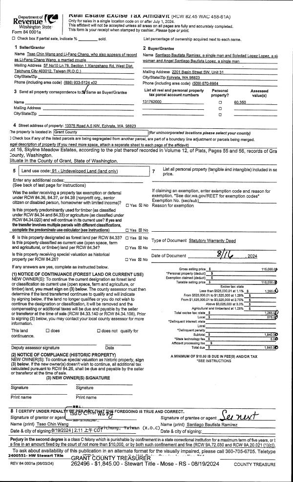 1 | 08/16/2024 | SWD | Statutory Warranty Deed | Wang, Tsao Chin & Li Fang Chang | Bautista Ramirez Etal, Santiago | | | $115,000.00 | 262496 | 1501648 |