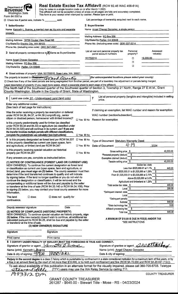 2 | 04/19/2024 | SWD | Statutory Warranty Deed | Busroe, Kenneth L | Chavez Gonzalez, Angel | | | $40,000.00 | 261287 | 1498343 |